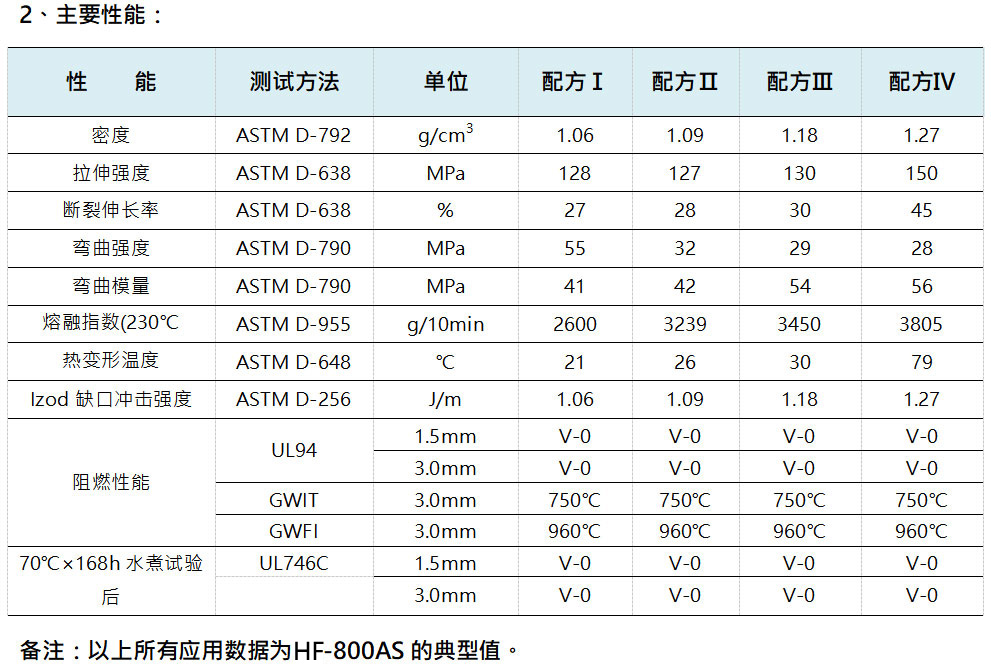 HF-800AS是一種以磷、氮為阻燃元素的無(wú)鹵環(huán)保阻燃劑,不受歐盟及其理事會(huì)通過(guò)的2002/95/EC號(hào)《關(guān)于在電氣電子設(shè)備中限制使用某些有害物質(zhì)指令》的限制。HF-800AS還具有阻燃制品密度小、發(fā)煙量低、模具腐蝕小的特點(diǎn)。