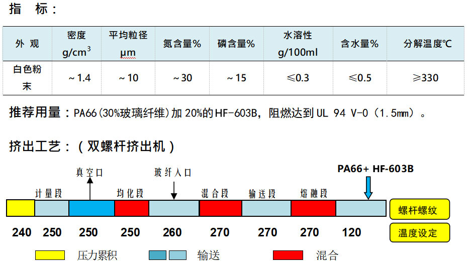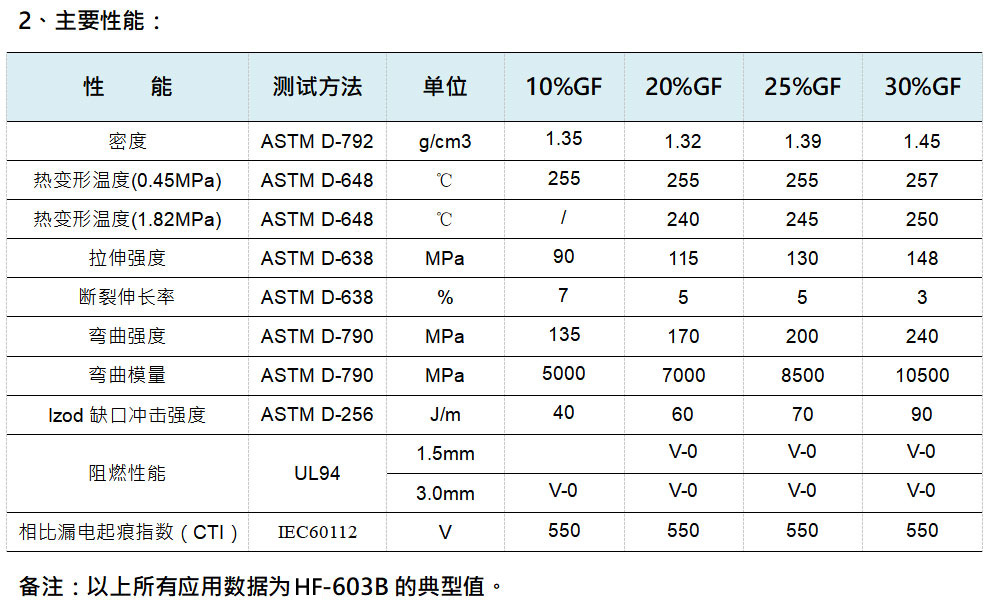 HF-603B玻纖增強(qiáng)PA6,66設(shè)計(jì)。以成炭、氣相阻燃機(jī)理起到阻燃作用。以HF-603B阻燃的玻纖增強(qiáng)PA6,66,阻燃達(dá)到UL94 V-0(1.5mm)并通過850℃灼熱絲測試。